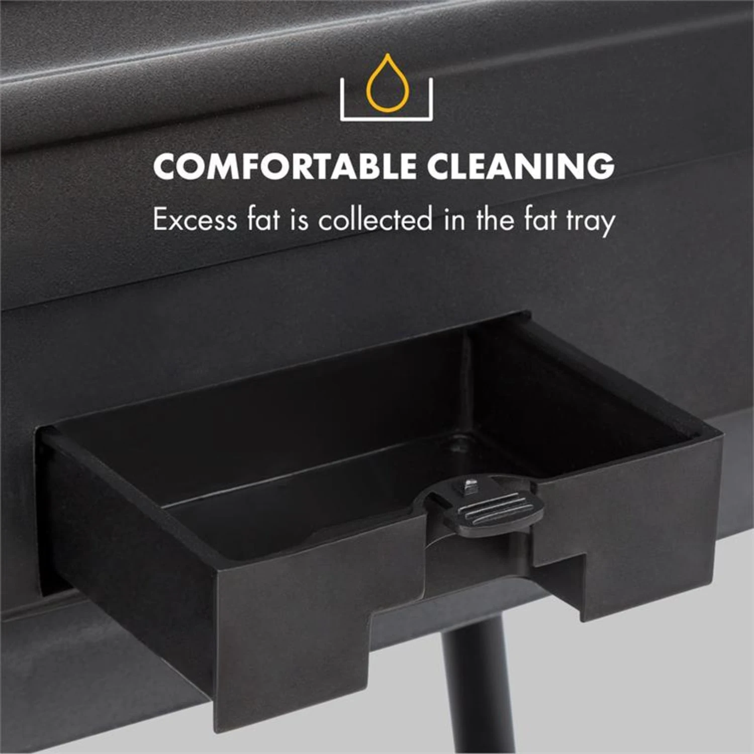 Der elektrische Grill mit bis zu 2200 Watt frei regulierbarer Heizleistung verfügt über einen abnehmbaren Standfuß, der auf vier robusten Beinen steht und sich hervorragend zum Grillen im Freien eignet. Wer lieber in der Küche brutzelt, kann ihn in Windeseile entfernen und erhält so einen Tischgrill. Damit nichts anbrennt und der Porterhouse Elektrogrill einfach zu reinigen ist, wurde die Grillplatte hochwertig beschichtet. Das Fett, das beim Grillen aus Fleisch und Fisch austritt, wird in einer Fettschale aus Kunststoff aufgefangen. Diese ist leicht zu reinigen und kann natürlich auch im Geschirrspüler gesäubert werden.