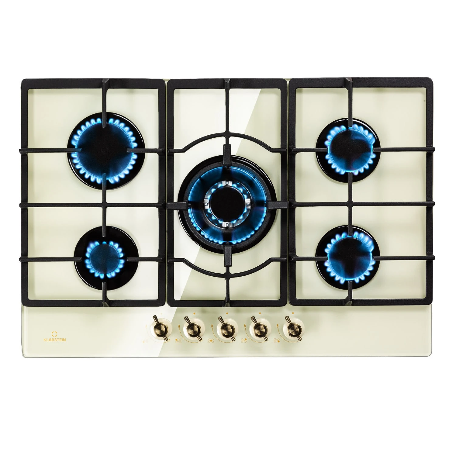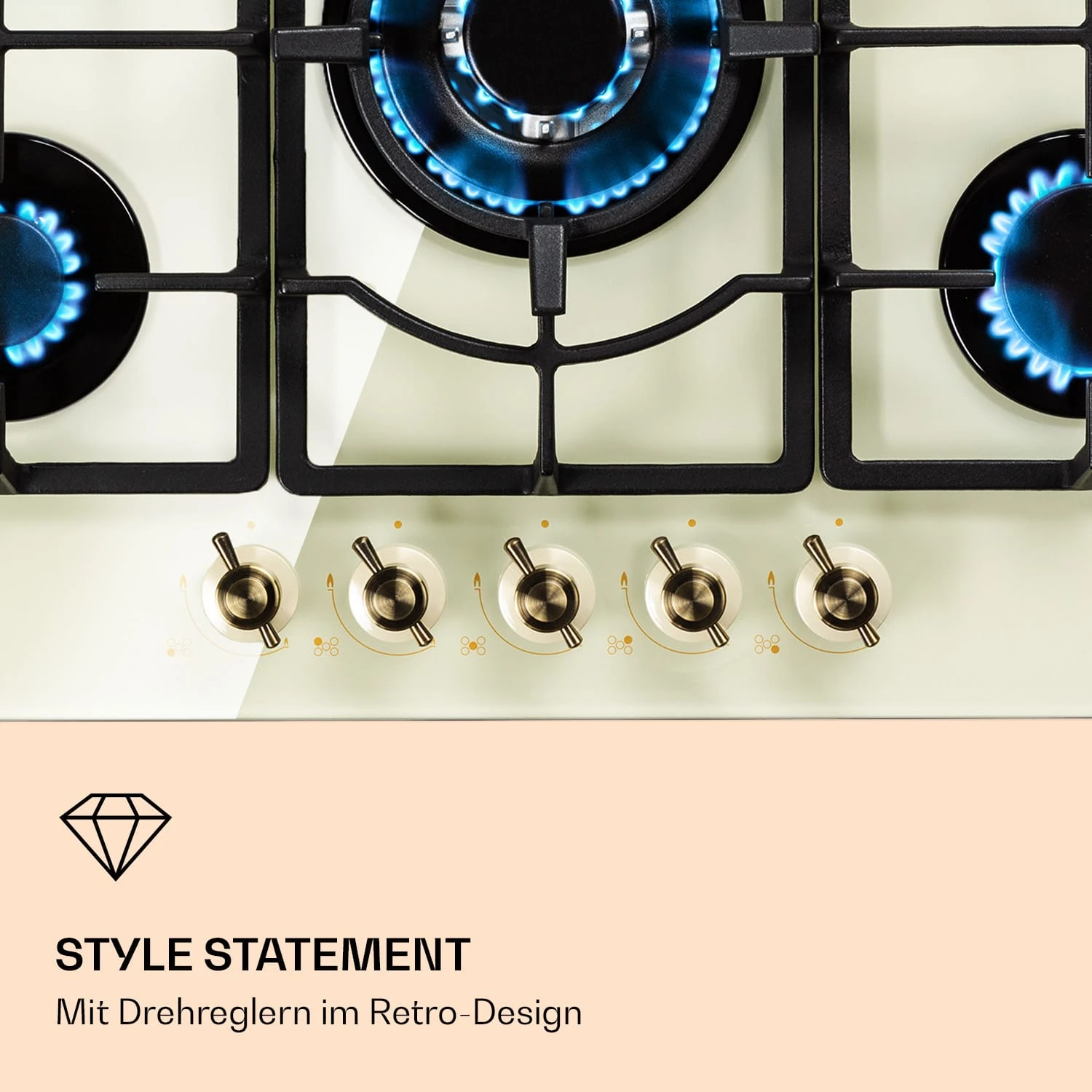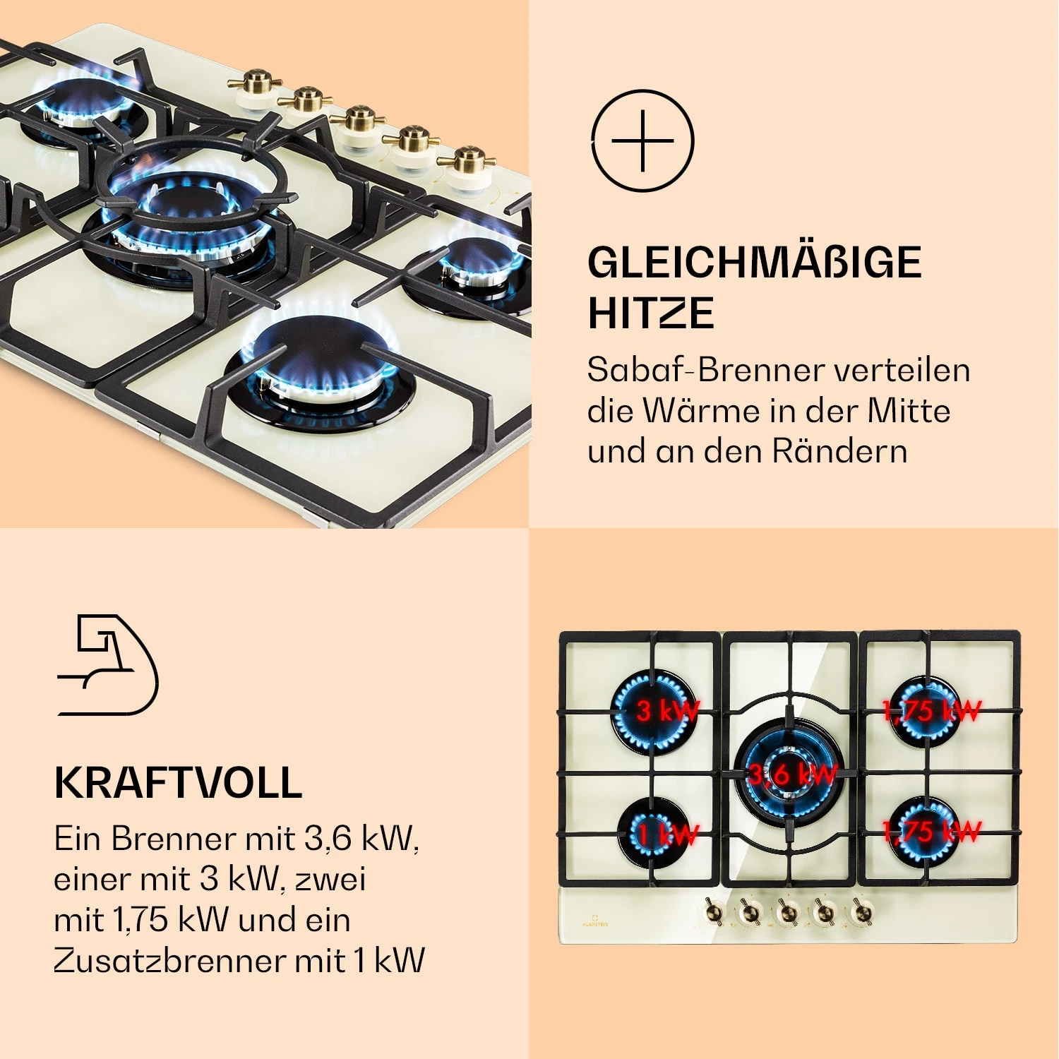 Auf dem geräumigen Klarstein Victoria 5 Gaskochfeld befinden sich fünf hochwertige Sabaf-Brenner, die mit einer Leistung von jeweils 3,6 kW, 3,0 kW und 1 kW sowie zweimal 1,75 kW ordentlich einheizen. Durch seine unterschiedlichen Brenner-Größen ist das Victoria 5 für jede erdenkliche Mahlzeit geeignet – dabei verteilen die Brenner die Hitze gleichmäßig in der Mitte und an den Rändern deines Kochgeschirrs, so wird alles perfekt gegart. Die Bedienung ist dank der selbsterklärenden Symbole an den großen im Retro-Design gestalteten Drehknöpfen absolut intuitiv, die Hitzezufuhr kann während des Kochvorgangs immer wieder direkt angepasst werden. Via SnapJetIgnition entzündest du die Flamme, somit ist kein zusätzliches Feuer nötig. Die drei abnehmbaren Kreuze aus massivem Gusseisen sitzen passgenau und kippsicher über den Flammen. Das Kochfeld ist mit einer gehärteten, pflegeleichten Keramikglas-Beschichtung versehen, die nicht nur gut aussieht, sondern auch besonders leicht zu reinigen ist.