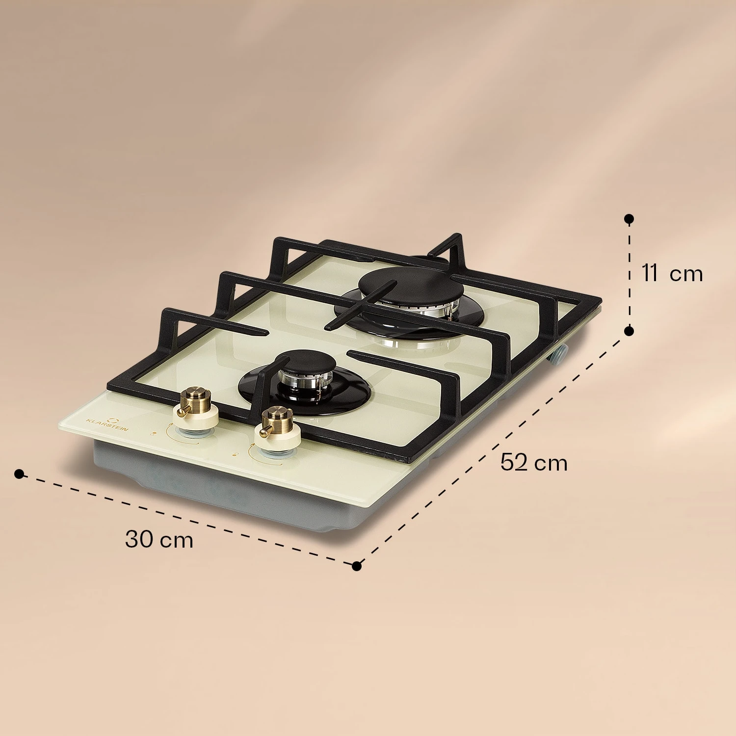 Auf dem platzsparenden Klarstein Victoria Domino Gaskochfeld befinden sich zwei hochwertige Sabaf-Brenner, die mit einer Leistung von 3 kW und 1 kW ordentlich einheizen. Die Brenner verteilen die Hitze gleichmäßig in der Mitte und an den Rändern deines Kochgeschirrs, so wird alles perfekt gegart. Die Bedienung ist dank der selbsterklärenden Symbole an den großen im Retro-Design gestalteten Drehknöpfen absolut intuitiv, die Hitzezufuhr kann während des Kochvorgangs immer wieder direkt angepasst werden. Via SnapJetIgnition entzündest du die Flamme, somit ist kein zusätzliches Feuer nötig. Das abnehmbare Kreuz aus massivem Gusseisen sitzt passgenau und kippsicher über den Flammen. Das Kochfeld ist mit einer gehärteten, pflegeleichten Keramikglas-Beschichtung versehen, die nicht nur gut aussieht, sondern auch besonders leicht zu reinigen ist.